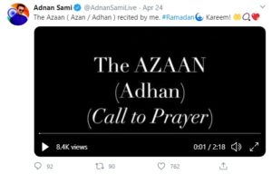 মাহে রমজান মাসকে স্বাগত জানিয়ে একটি আজানের ভিডিও ক্লিপ টুইট করে ভক্তদের শুভেচ্ছা জানান আদনান সামি। ক্যাপশনে লিখেছেন, ‘আমার কণ্ঠে আজান। রামাদান করীম।’The Azaan ( Azan / Adhan ) recited by me. Ramadan Kareem!