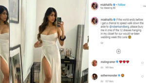 এ পোস্টে মিয়া খলিফাকে হোয়াইট স্লিট গাউন পরা দেখা যাচ্ছে। গতবছর মার্চে মিয়া খলিফাকে প্রোপোজ করেন সুইডিশ শেফ রবার্ট স্যান্ডবার্গ। এ বছরের জুনে বিয়ের পিঁড়িতে বসার কথা ছিল তাদের।