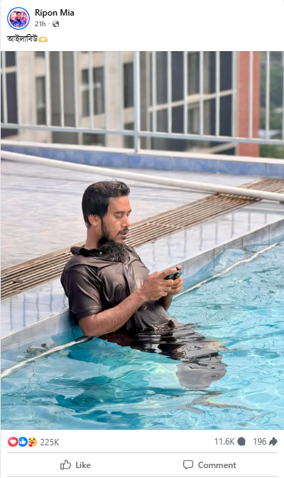 আইকোনিক ফোকাস ডেস্কঃ নানা জল্পনা-কল্পনার পর আলোচিত কনটেন্ট ক্রিয়েটর রিপন মিয়া সামাজিক মাধ্যমে আবারও ফিরে এসেছেন। সোমবার রাতে তার ফেসবুক পেজে একটি ছবি পোস্ট করা হয়, যেখানে দেখা যাচ্ছে, তিনি নীলচে পানির সুইমিংপুলের ধারে দাঁড়িয়ে আছেন। ছবির ক্যাপশনে মাত্র এক শব্দ ‘আইলাবিউ’।